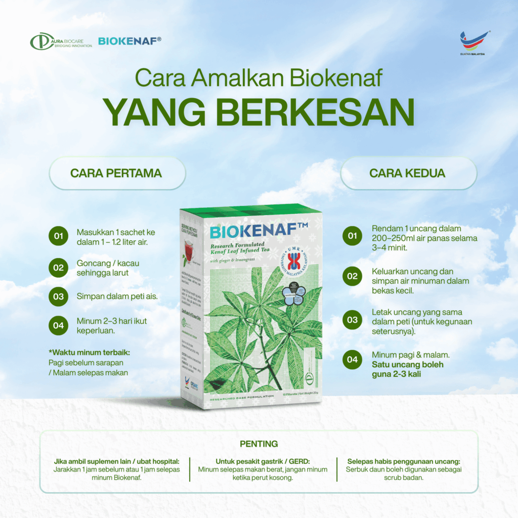 Biokenaf® diformulasi untuk bantu rawat masalah diatas. Sekiranya ada gastrik, betulkan masa makan terlebih dahulu sebelum amalkan teh herba Biokenaf®